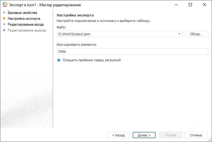 На странице «Настройка экспорта» указывается файл для экспорта данных.