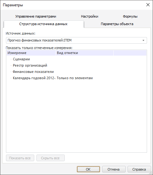 В раскрывающемся списке «Источник данных» выберите срез данных. После выбора среза данных в области «Показать только отмеченные измерения» будет сформирован список всех измерений, содержащихся в данном срезе.