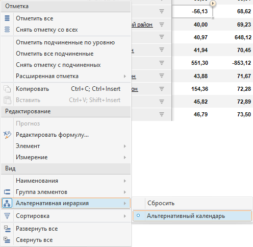 После того, как была настроена агрегация по уровням альтернативной иерархии в контекстном меню измерения «Календарь» будут доступны пункты:
