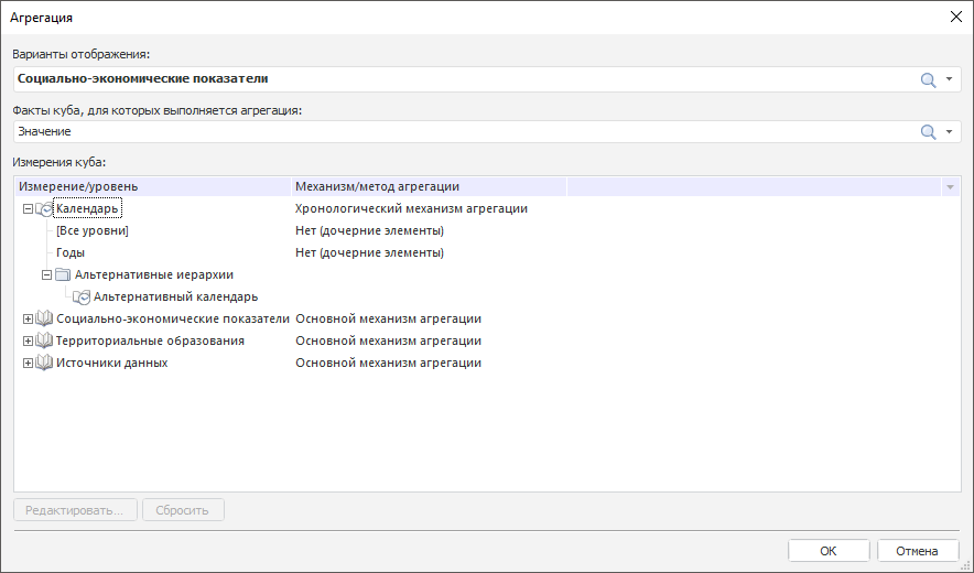 При выборе пункта «Альтернативный календарь» будет применена агрегация по уровням альтернативной иерархии, заданная при настройке агрегации стандартного или автоматического куба;