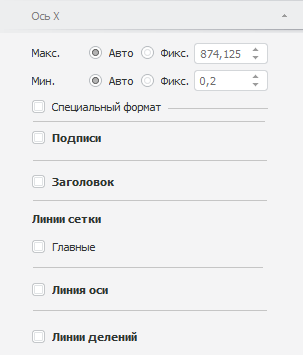 Для настройки параметров осей диаграммы используйте вкладки «Ось Х» и «Ось Y» на боковой панели. Набор параметров на вкладках совпадает.