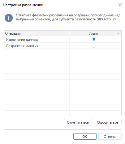 Отметьте флажками разрешения на операции, производимые над выбранным объектом, для пользователя или группы пользователей с помощью множественной отметки или кнопками/пунктами контекстного меню: