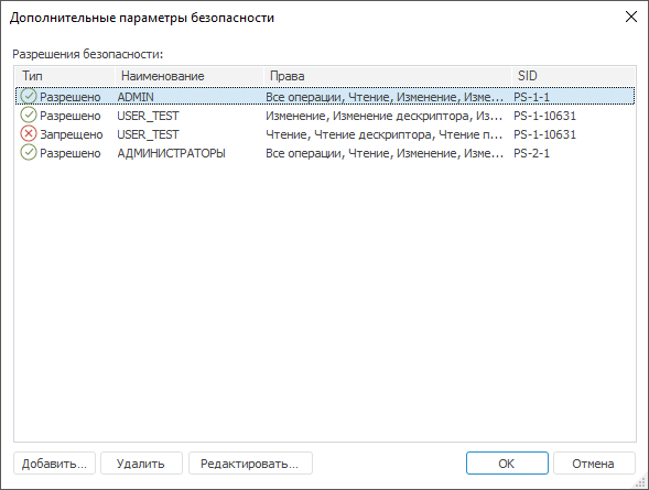 Задайте права по операциям, которые необходимо разрешить/запретить в списке «Разрешения для выбранного».