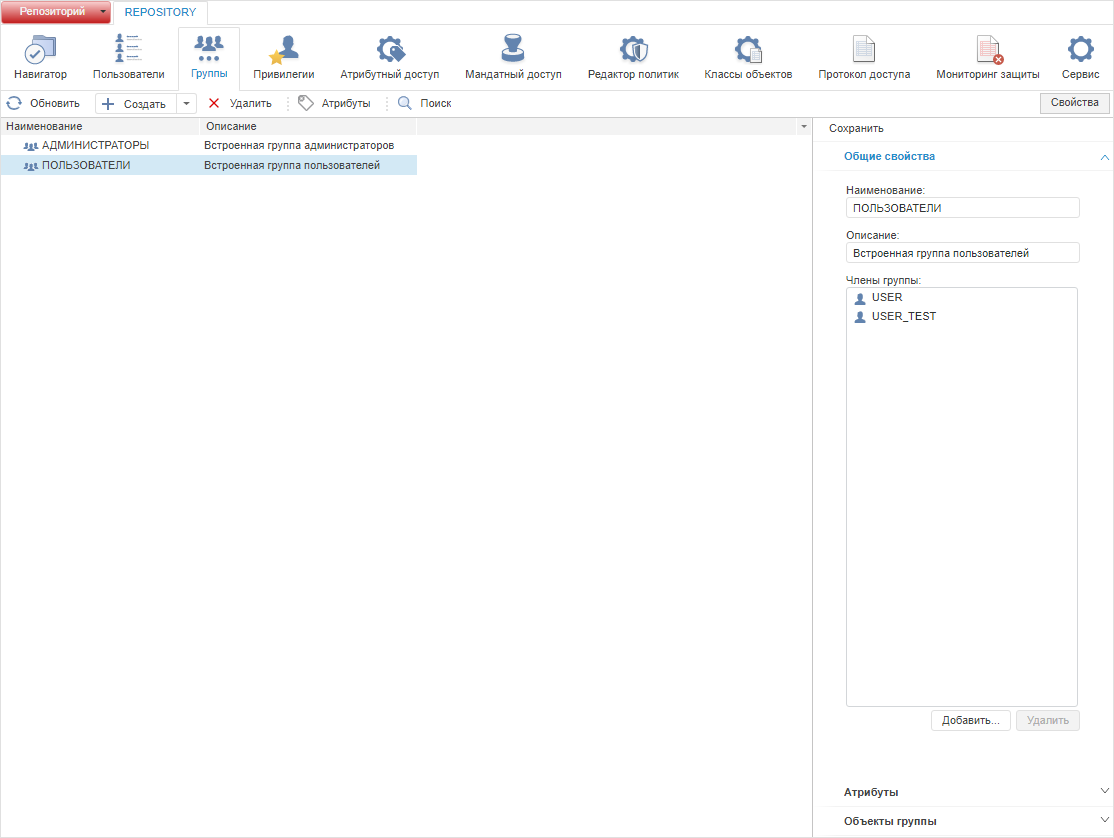 Примечание. При разделении ролей между администратором информационной безопасности и прикладным администратором раздел «Группы» будет доступен только администратору информационной безопасности.
