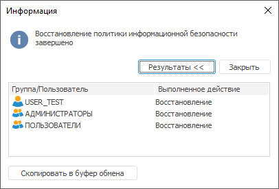 После восстановления политики информационной безопасности выдаётся запрос на обновление пользователей. Обновление пользователей необходимо для корректной работы. При положительном ответе происходит запуск механизма обновления пользователей. Окончание процесса сопровождается сообщением о завершении восстановления политики безопасности: