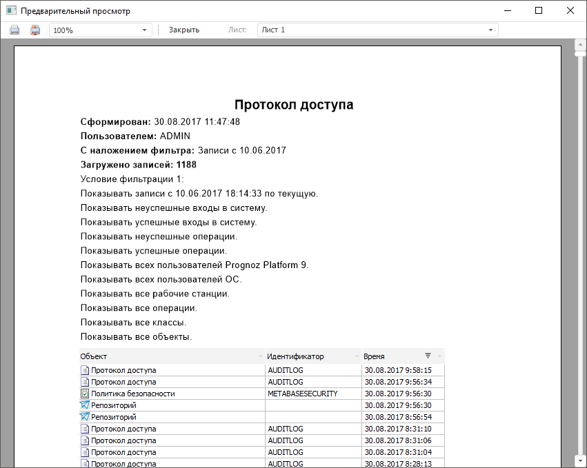 Для предварительного просмотра и печати в протоколе доступа учитывайте настроенное отображение столбцов и используемую фильтрацию в таблице.