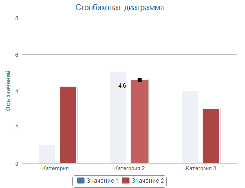 После выполнения примера для созданной диаграммы будет доступно редактирование рисованием. Для редактирования значений ряда необходимо выбрать его в легенде. После этого на диаграмме у выбранного ряда будут выделены точки, при движении курсора мыши над диаграммой будут затемнены области каждой точки ряда. Для изменения значения точки необходимо зажать левую кнопку мыши и перемещать указатель по вертикали. Не отпуская кнопки мыши, можно продолжить редактирование соседних точек. Рядом с курсором будет отражаться новое значение точки: