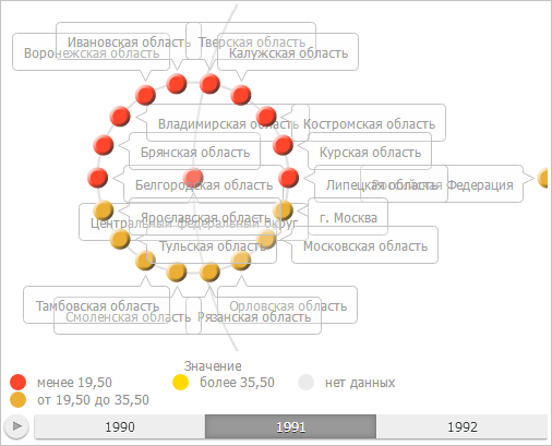 Для выполнения примера необходимо наличие на html-странице компонента BubbleTreeBox с наименованием «bubbleTreeBox» (см. «Пример создания компонента BubbleTreeBox»). Отобразим на легенде 3 интервала и расположим её под областью построения пузырькового дерева слева: