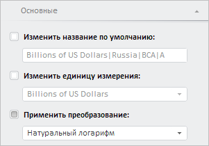 // Получим панель свойств рабочей книги var propertyBar = workbookBox.getPropertyBarView(); // Получим панель «Основные» var mainSeriesPanel = propertyBar.getMainSeriesPanel(); // Отобразим панель mainSeriesPanel.show(); // Развернём панель mainSeriesPanel.expand(); // Обновим раскрывающийся список «Применить преобразование» propertyBar.updateViewAsMenu();