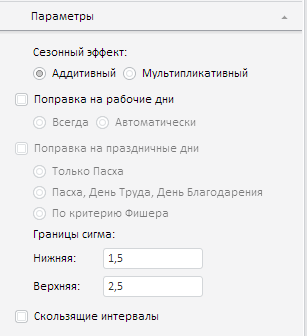 Для отображения панели необходимо выбрать на вкладке ленты инструментов «Вычисления», нажать на кнопку «Сглаживание» и в выпадающем списке выбрать «Выделение сезонности( XII)», на вкладке панели свойств «Ряд» раскрыть панель «Параметры».