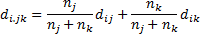 Межкластерное расстояние и, соответственно, метод пересчета межкластерного расстояния между произвольным кластером i и кластером, образованным посредством объединения кластеров j, k может быть определен одним из способов: