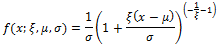Для x ≥ μ при ξ ≥ 0 и μ ≤ x ≤ μ - σ / ξ при ξ < 0, где: