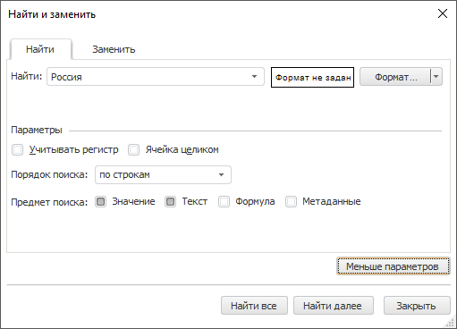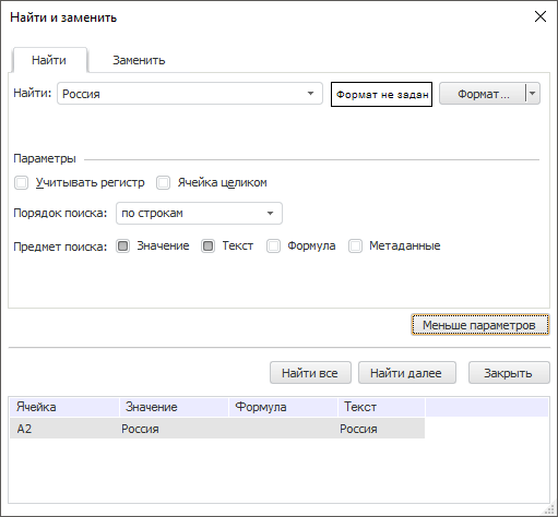Примечание. Если параметры не задаются, по умолчанию поиск производится по всей рабочей книге по строкам, без учета формата искомых ячеек, регистра и других параметров. Поиск осуществляется по тексту в ячейках таблицы.