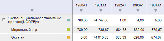 при выполнении метода из категории «Прогнозирование» - «Экспоненциальное сглаживание: прогноз(<Имя_Ряда>)». Например: