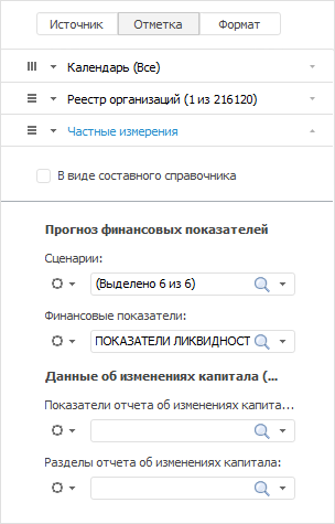 Изначально при настройке отображения данных из нескольких источников отметка в общих измерениях и отметка в частных измерениях из первого источника соответствует отметке, настроенной в используемых источниках. Отметка в частных измерениях второго и последующих источников соответствует отметке из сохранённых представлений используемых источников.