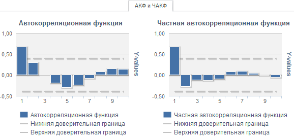 Вкладка «АКФ и ЧАКФ» содержит результаты автокорреляционного анализа: значения автокорреляционной функции и частной автокорреляционной функции для моделируемой переменной. Пунктиром отображаются границы доверительного интервала.