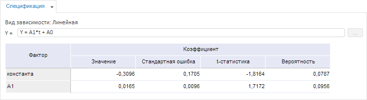 На вкладке «Спецификация» содержатся: идентифицированное уравнение с оцененными коэффициентами и таблица коэффициентов.