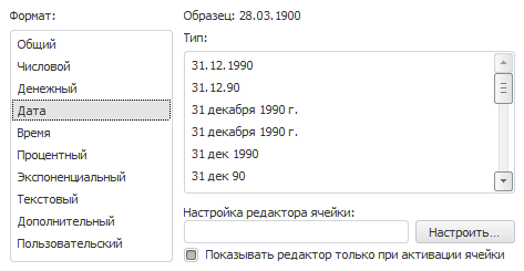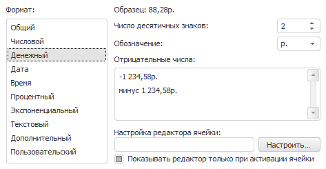 Вкладка содержит список предустановленных форматов отображения содержимого ячеек листа. Выберите формат данных и настройте его параметры. Вид вкладки и набор настроек зависит от используемого инструмента.