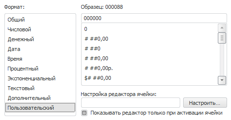 Текущие настройки редактора ячейки отображаются и настраиваются в поле «Настройка редактора ячейки». В этом поле определяется тип редактора ячейки для удобного ввода/выбора значений. Параметры отображения задаются в виде специально сформированной строки, в которой указывается вид редактора, значение по умолчанию и т.д. Строка может быть отредактирована как непосредственно в поле ввода, так и при помощи специального диалога «Параметры редактора значений». Для открытия диалога нажмите кнопку «Настроить». По умолчанию параметр отображения устанавливается в соответствии с выбранным типом параметра. Для отображения всегда активного редактора ячейки снимите флажок «Показывать редактор только при активации ячейки».