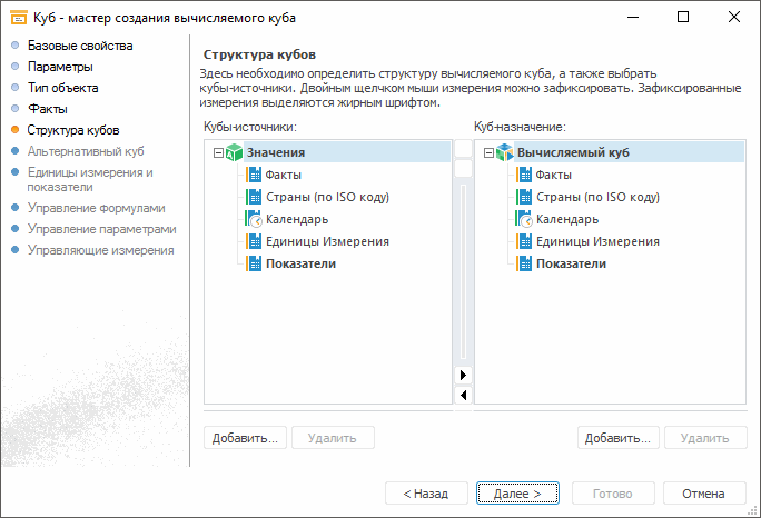 На странице «Структура кубов» определяется структура вычисляемого куба. Выбираются кубы-источники и определяются измерения вычисляемого куба.