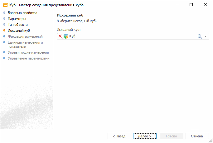 На странице «Исходный куб» выбирается куб, на основе которого будет построен представление-куб.