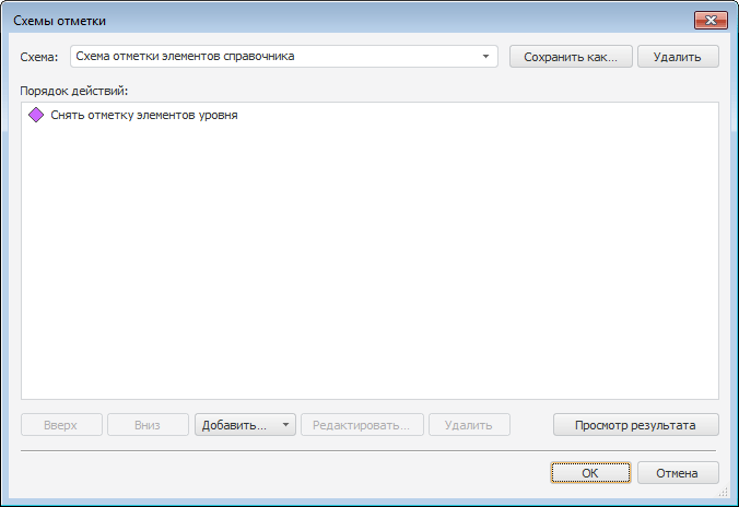 В открывшемся диалоговом окне «Схемы отметки» нажмите кнопку «Добавить» и выберите из раскрывающегося списка вариант «Отметить уровень». В список «Порядок действий» будет добавлен элемент «Отметить элементы уровня»: