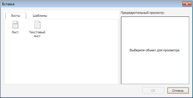 выполните команду контекстного меню «Добавить лист» на вкладке листа. После выполнения действия будет открыто окно «Вставка»: