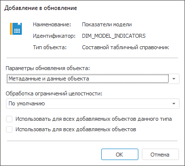 При добавлении в обновление таблицы, справочника НСИ, автоматического куба или базы данных временных рядов будет открыто диалоговое окно «Добавление в обновление»: