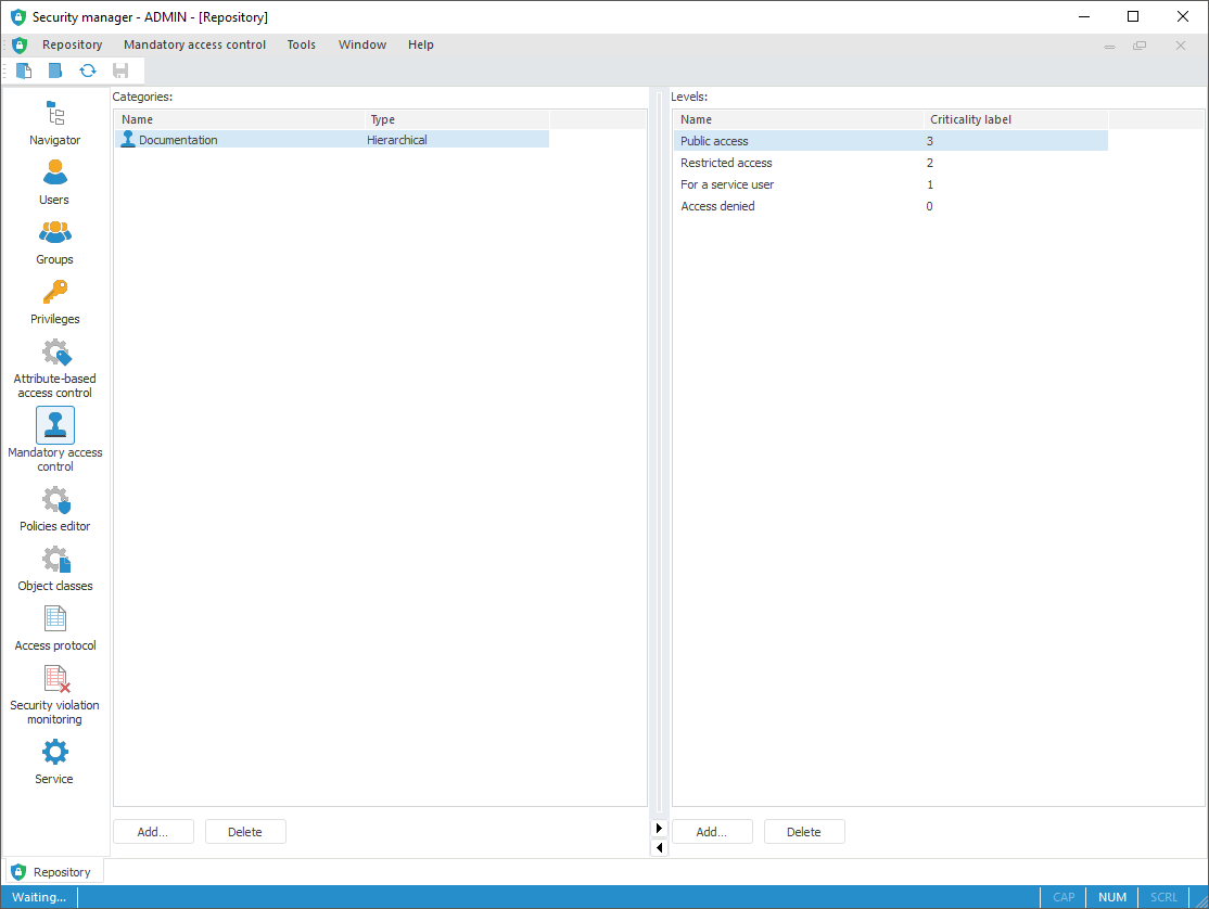 To add security categories and levels, use the Mandatory Access Control section on the navigation panel.