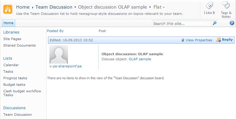 After one of the operations is executed, the user is redirected to the SharePoint portal page with the published topic Object discussion <published report name>: