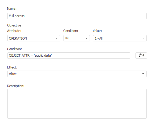 The policy contains a rule allowing the full access to objects with the "open data" value of the ATTR custom attribute. The full access condition is set using the OPERATION environment attribute.