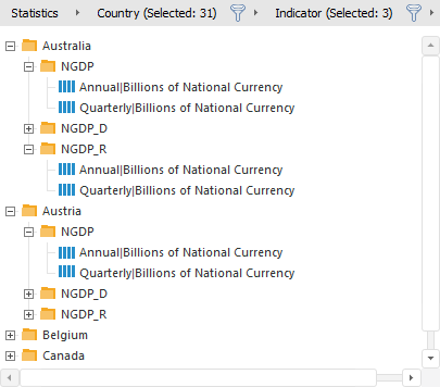 A series tree shows the tree structure of the open data source elements. The structure of the series tree is based on the chain of attributes defined in the breadcrumb. Levels of the hierarchy of the series tree are shown as folders, which names correspond to attribute values. Multiple elements can be selected in the series tree by holding down SHIFT or CTRL.