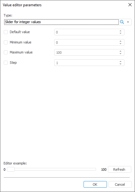 Default Value. Determine the editor value to be displayed by default. This value must be in the range of available values determined for the editor. If the range of available values for the editor is not set, the value must be in the range [-2147483648; 2147483647].