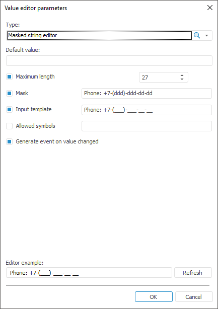 The masked string editor enables the user to limit the range of characters that can be entered and to determine format (or template) of the entered value. This type of editor can be used to enter phone numbers, postal and other codes, identifiers, and so on.