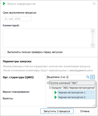 В результате выбранные экземпляры подпроцесса будут перезапущены с первого или последнего шага, в зависимости от настроек, заданных в мастере шага «Вызов подпроцесса».