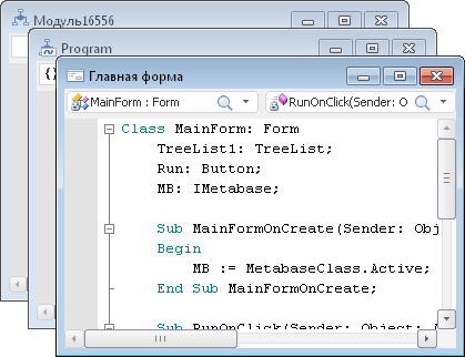 Иногда в процессе разработки (написания) модулей (форм) необходимо одновременно просматривать (редактировать) текст сразу нескольких макросов. Для организации окон можно воспользоваться различными командами из раздела главного меню «Окна».