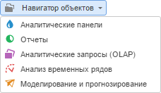 в инструментах «Аналитические запросы (OLAP)», «Аналитические панели», «Отчёты» и «Рабочее пространство»: