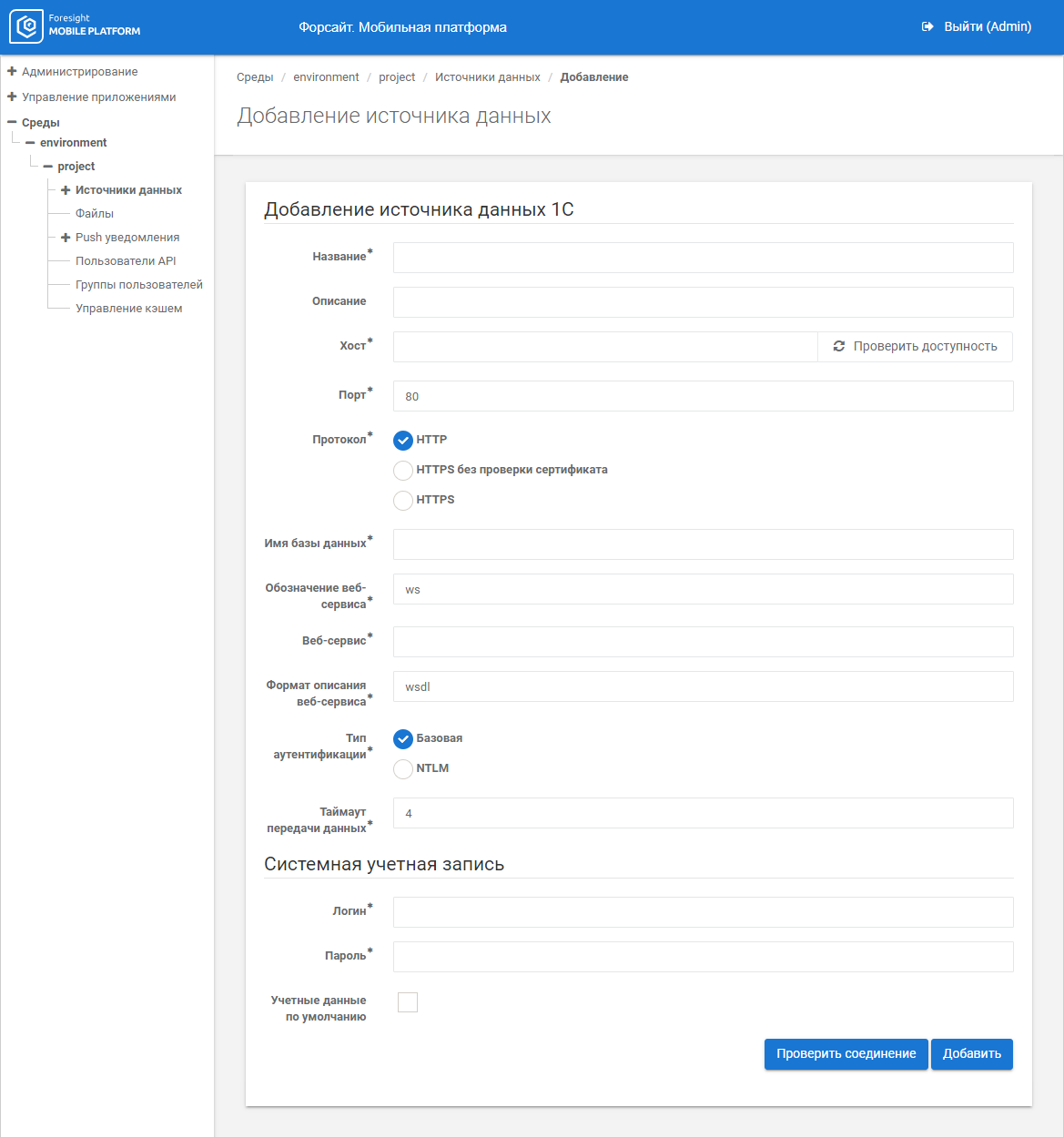 Примечание. Для источников данных JSON, WEB, Foresight Web автоматически добавляются анонимные учетные данные по умолчанию на вкладке «Учётные данные» после настройки подключения. Для источника данных Exchange добавление учетных данных доступно только после настройки подключения.