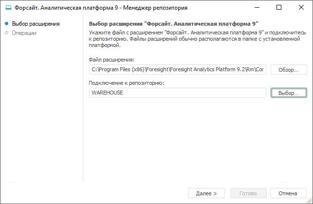 Установка каждого расширения производится из файла в существующий репозиторий с помощью инструмента «Менеджер репозитория». Необходимые файлы входят в комплект поставки продукта «Форсайт. Аналитическая платформа» и включены во все инсталляторы, кроме Standard и SecServer. После установки «Форсайт. Аналитическая платформа» файлы расширений будут доступны в папке «S\Rm\», где S - путь до места установки «Форсайт. Аналитическая платформа».