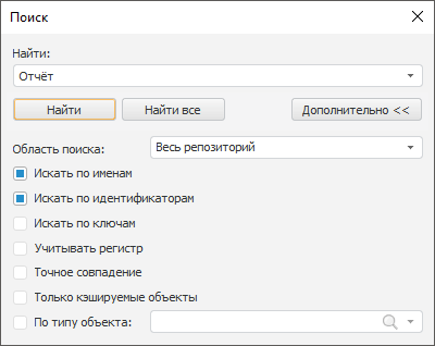 Учитывать регистр. Установка данного флажка позволяет при поиске учитывать регистр букв (например, если в поле поиска указано «Отчет», то не будут найдены объекты, содержащие в наименовании и/или идентификаторе «отчет» и «ОТЧЕТ»);