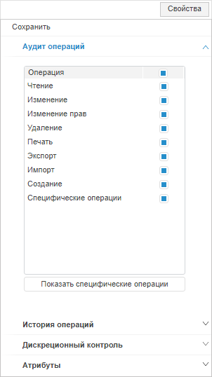 В списке общих операций содержится строка и кнопка «Специфические операции»/«Показать специфические операции», которая определяет настройку аудита по специфическим операциям.