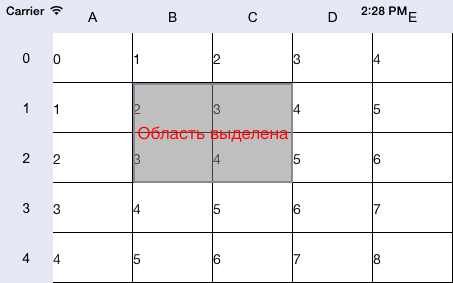 В результате выполнения примера был выделен диапазон ячеек таблицы, охватывающий строки и столбцы с номерами 1 и 2. Поверх выделения была отображена надпись с текстом, выровненным по центру и сообщающим о выделении ячеек:
