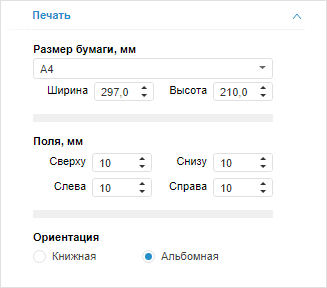 Для настройки параметров печати и экспорта аналитической панели перейдите на вкладку «Печать» боковой панели.