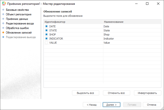 Для выбора полей для обновления в источнике и приёмнике данных используйте страницу «Обновление записей».