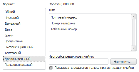 Вкладка содержит список предустановленных форматов отображения содержимого ячеек листа. Выберите формат данных и настройте его параметры. Вид вкладки и набор настроек зависит от используемого инструмента.