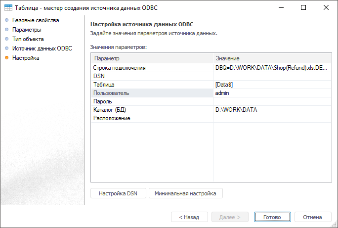 После создания источника данных ODBC можно открыть его в режиме просмотра (редактирования).