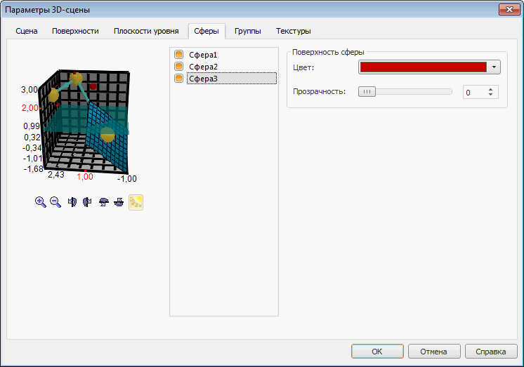 Для настройки параметров сферы перейдите на вкладку «Сферы» окна «Параметры 3D-сцены»: