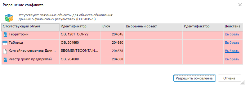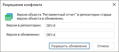 Соответствующий объект находится под управлением VCS. Конфликт возникает, если в обновлении существуют объекты, добавленные в систему управления версиями. Для разрешения конфликта следует нажать на гиперссылку в поле «Конфликт» и подтвердить обновление: