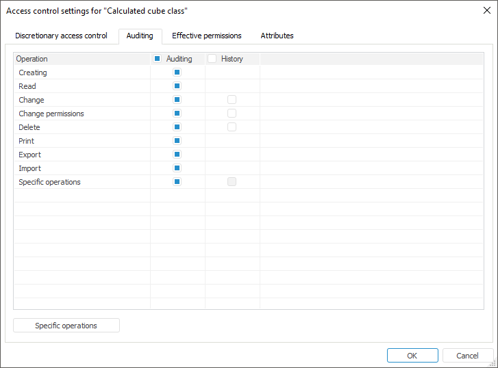 The list of common operations includes the Specific Operations string or the Show Specific Operations button, which enables the user to determine whether auditing of specific operations is set up.
