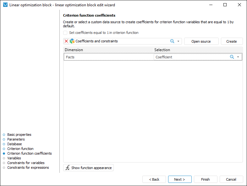 Select the data source to create criterion function coefficients. This data source must contain all dimensions of controlling variables selected on criterion function setup. To create a data source with required structure, click the Create button.
